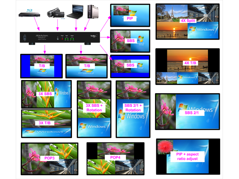 4. PIP/POP to add second video content on the screen with flexible image size, aspect ratio and position adjustment.