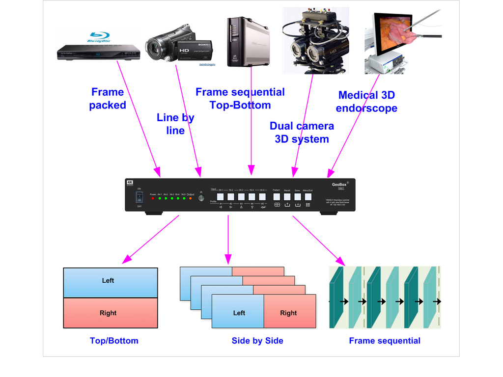 Medical devices may have special 3D formats and can't be displayed in conventional 3D display devices. GeoBox can convert this kind of 3D format into side by side, top/bottom or frame sequential 3D formats so that it can be supported by most of 3D devices. G901 is the device that can convert line by line (line interleaved), frame packed, side by side, top/bottom and frame sequential or dual camera 3D formats into side by side, top/bottom or frame sequential 3D formats for conventional 3D display devices.